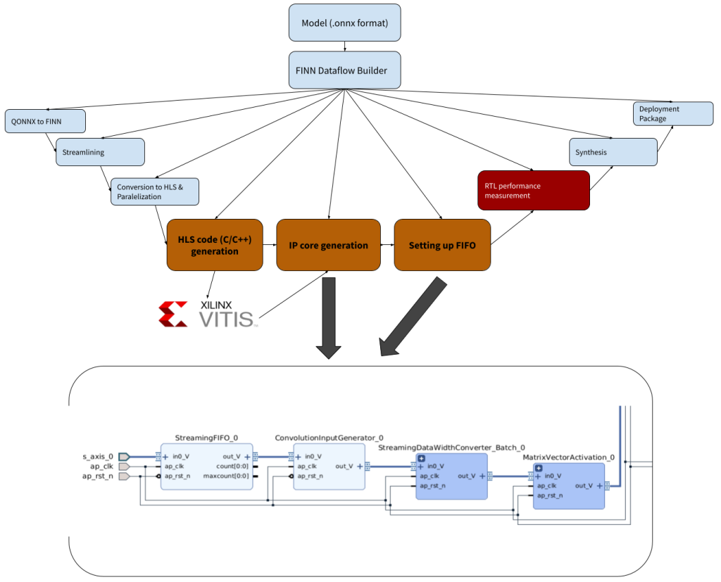 Interconnects manage continuous dataflow while Clock Management synchronizes operations. Memory elements offer efficient on-chip storage, and DSP slices accelerate arithmetic operations. Custom JSON files in FINN enable precise definitions of components like Processing Elements (PE), Multiple Data (SIMD), number of DSP slices and custom set of instructions which optimizes each layer and operation for efficient model-FPGA interaction. Depending on the elements we set for the FPGA and Deep Learning model, we are doing steps which include streamlining, conversion to HLS code and parallelization. As is shown in the Figure 3. below, those processing steps are required to generate an IP core which will be doing computational tasks for image processing through neural networks. The end result is the deployment package which is required to be explicitly run on an FPGA.