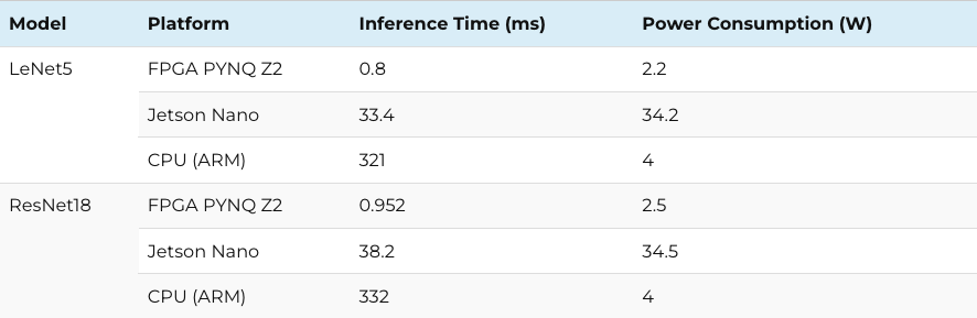 When compared to the Jetson Nano and CPU (ARM), the FPGA’s performance becomes even more impressive.The Jetson Nano has an inference time of 33.4 ms and 38.2 ms and power consumption of 34.2 W and 34.5 for LeNet5 and ResNet18, respectively. Similarly, the CPU (ARM), with an inference time of 321 ms and 332 ms and a consistent power consumption of around 4 W for both models, lags behind the FPGA in both speed and efficiency.