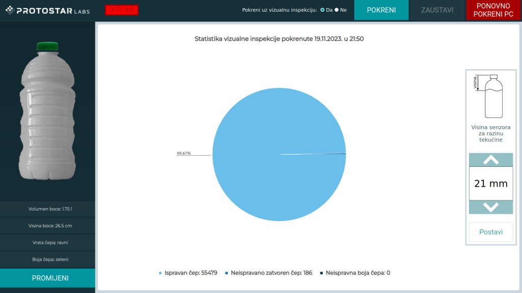 In one of our use cases, the same production line is used to fill various bottle sizes (0.5L, 1L, 1.5L and 1.75L), various bottle cap colors and additionally, the same sized bottle can contain different product which is required to be filled to a different level depending on the product type. That particular scenario demanded that we install separate actuators for cameras and liquid level sensor so that every bottle size cap can be inspected from the correct height for optimal results and, at the same time, every bottle liquid level can be precisely measured to meet the production standard or even fine-tuned by the operator to a specific level using the graphical user interface.